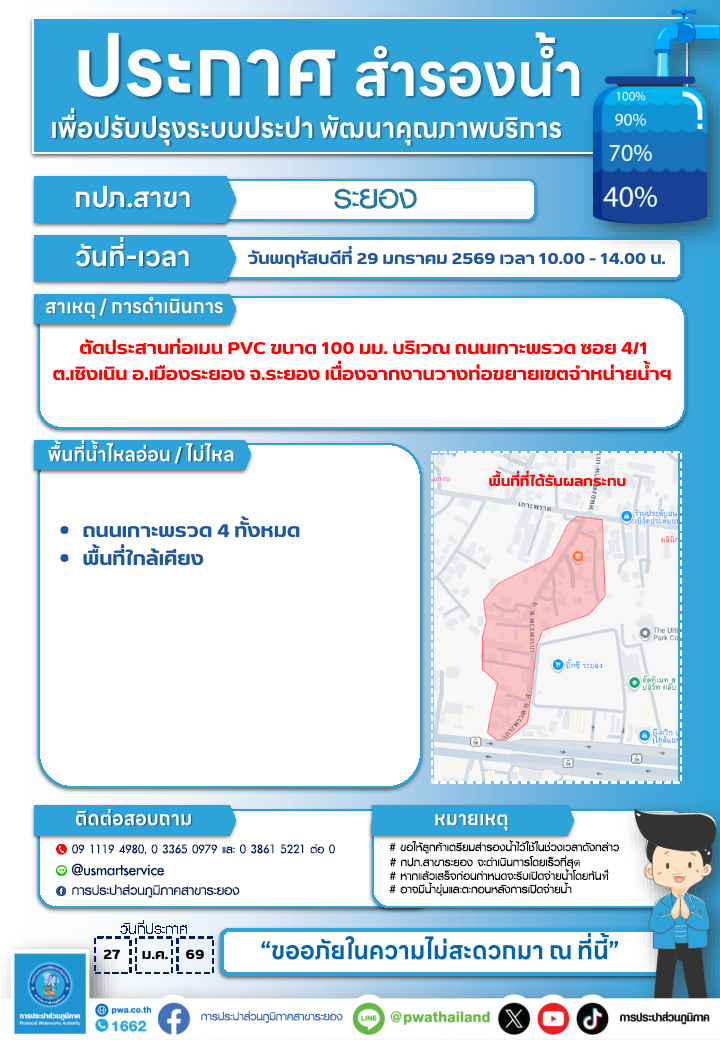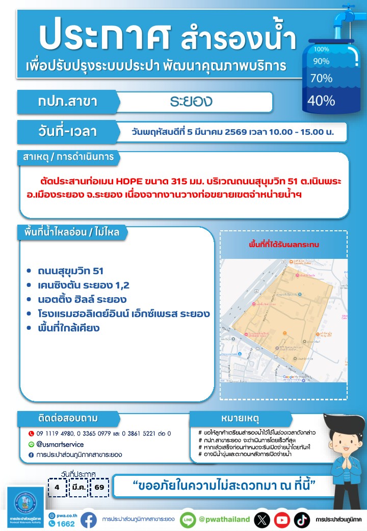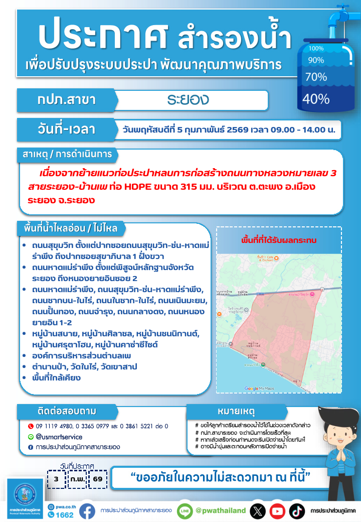 🔹ผลกระทบทำให้น้ำไหลอ่อน-ไม่ไหลในพื้นที่อำเภอเมืองระยองทั้งหมดที่ใช้น้ำของการประปาส่วนภูมิภาคสาขาระยอง หากดำเนินการเสร็จแล้วจะทยอยเพิ่มแรงดันน้ำอย่างต่อเนื่อง จึงเรียนมาเพื่อทราบ